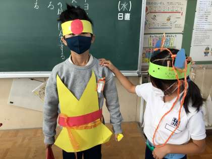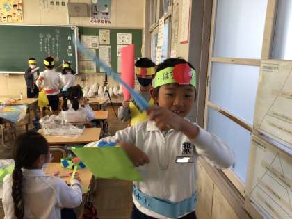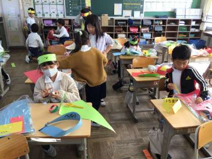 2年生が、図工で輪っかを使って色々なものを作りました。