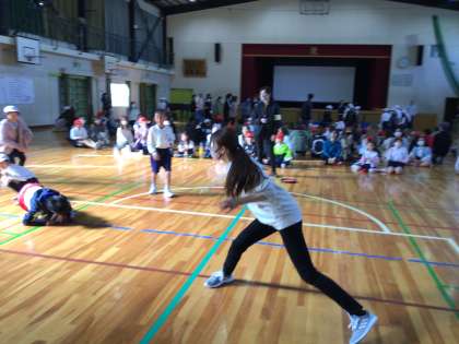 1〜4年生は、親子対抗ドッチビー大会を行いました。保護者の方は、手加減をしながら行なっていましたが、子どもたちの上手さに徐々に真剣になってしまう場面もありました。審判の役員さんの采配で「特別ルール」が適用され、子どもたちが勝利することが多かったです。