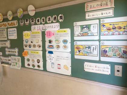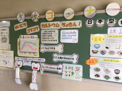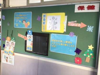 食育は、栄養教諭から、日本型の食事のすすめと、歯を強くすることに関しての掲示物が貼られています。保健は、養護教諭から感染症予防に関する掲示物が貼られています。