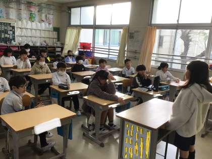 「私の好きな時間は、体育です。その中でも、一番好きな授業はマット運動です。、、、、、、皆さんはどうですか」などと、好きな時間を紹介しています。原稿を見ないで、頑張って発表しています。