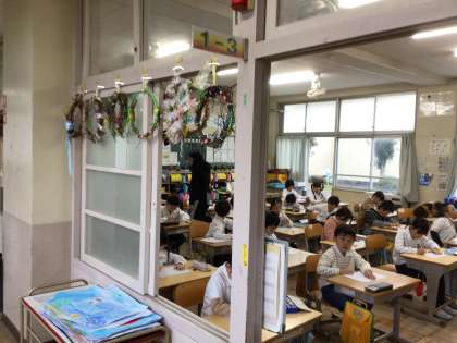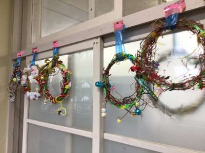 1年生が、夏に育てた朝顔のツルを使って、リースを作りました。