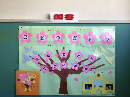 学校サポーターの図書ボランティアの方々が、卒業祝いの掲示物を作ってくださいました。