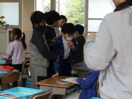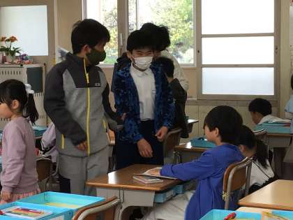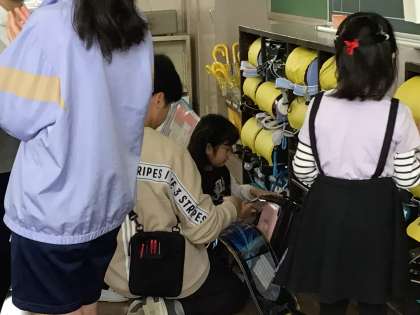 1年生が、朝のお支度を頑張っています。なかなかできない時は、6年生が手伝ってくれます。