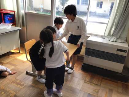 6年生が、1年生に掃除の仕方を教えています。