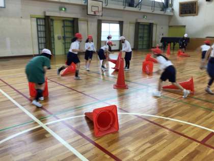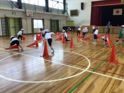クラスで半分の人が一斉に、立ててある赤の三角コーンを倒し、半分の人が建てるというゲームをしました。