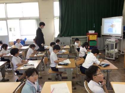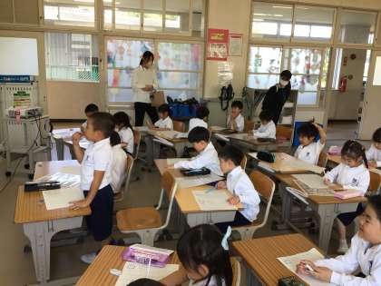 先週、こども園等の先生方が、1年生の様子を見に来てくれました。