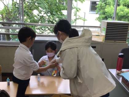 6年生が、下の学年の児童に作り方を教えるために、各教室に出向いていました。