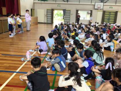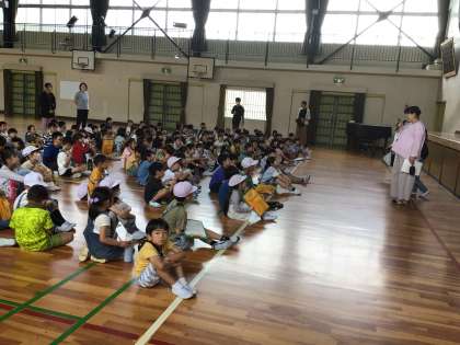 体育館で、お話を聞いてから、出発です。