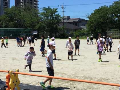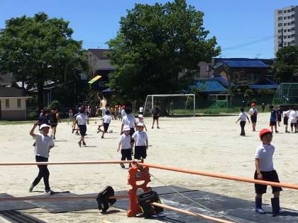 晴れやかな青空の下、子ども達は楽しく遊んでいます。