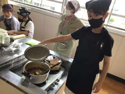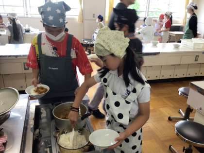 5年生が、キャンプに向けて、調理実習でカレーライスを作りました。