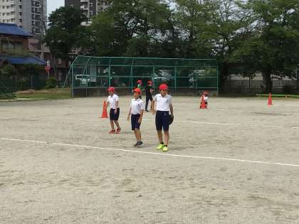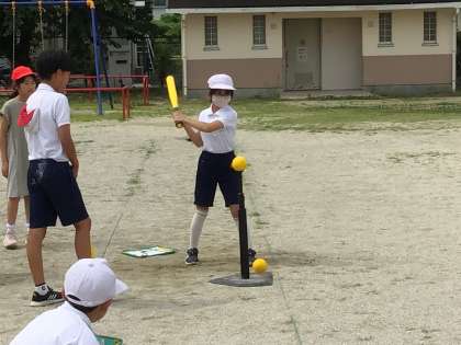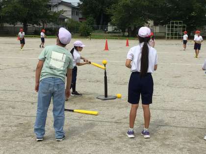 5年生が体育の学習で、「Tボール」を行っています。「Tボール」とは、ピッチャーの代わりにT字の支柱の上にボールを置いて打つソフトボールです。今日は、バッテング大会で、打った距離によって得点を競うゲームを行いました。