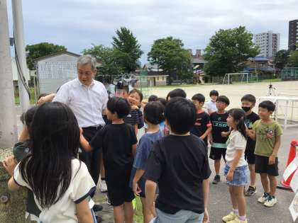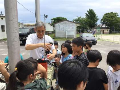 4年生の理科の「閉じ込めた空気や水」の学習で、空気が縮む性質を生かして、ペットボトルロケット飛ばす実験を行いました。