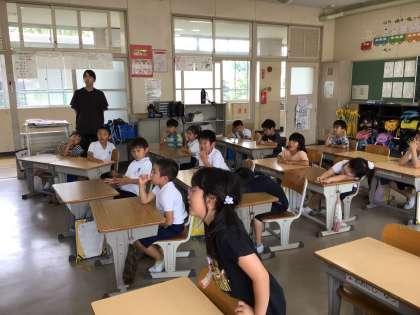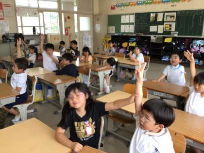 栄養教諭が、1年生に箸の持ち方の授業をしています。