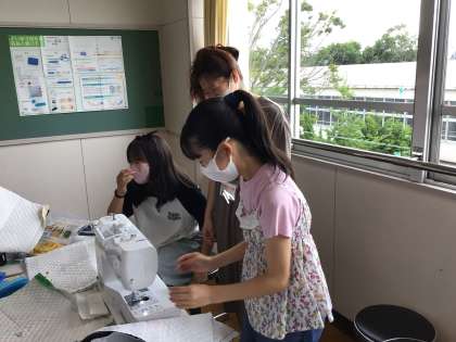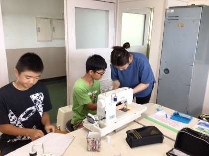 6年生が、家庭科の学習でナップザックを作っています。長さを測ったり、ミシンの操作に手間取っている子もいます。
