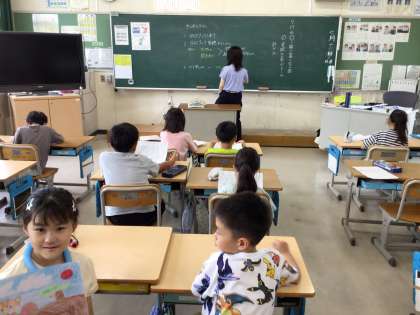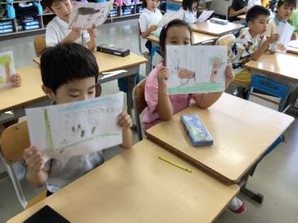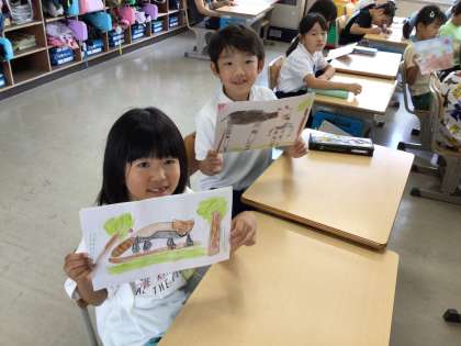 2年生が、国語の時間に、ガイドブックを作成しました。色々な生き物について調べて、絵と文章を書きました。発表するために、練習をしています。
