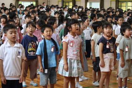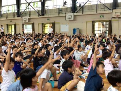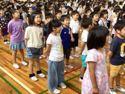 校長からは、新しいお札に描かれている人物の功績の話と、オリンピックが始まる話をし、人のために役立った人や、困難を乗り越えて頑張っている人からパワーをもらい、夏休みに「好きなこと・自慢できることをきわめよう」というお話をしました。