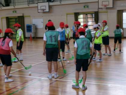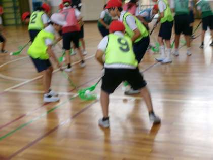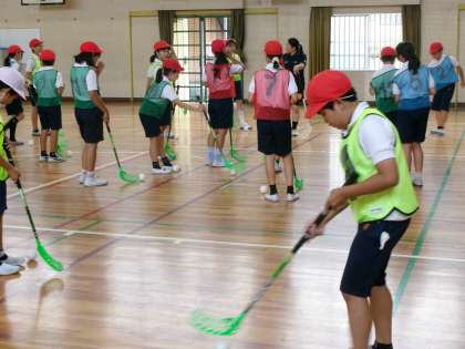 障害のあるなしにかかわらず誰もができるスポーツとして、「フロアーボール」をしました。室内で行うミニホッケーのようなスポーツです。