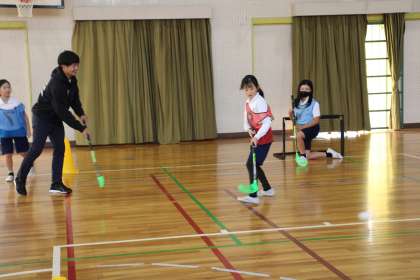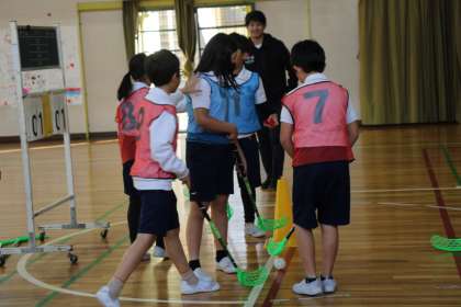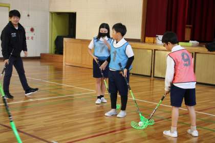 ユニファイドスクールとは、知的障害がある人もない人も一緒に楽しむスポーツを推進することです。その一環として、これまでに4年〜6年生は、体育の授業でフロアーボール(室内ホッケー)に取り組んできました。