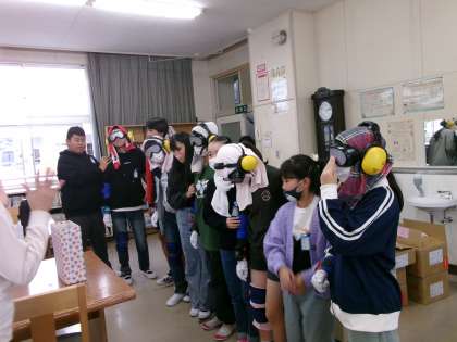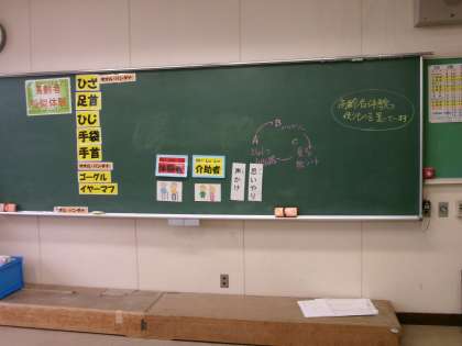 子ども達は、見えにくいゴーグルを付け、膝関節が曲がりにくいようにサポーターや重りを付けて高齢者の気持ちになって階段を上ったり、字や絵を見たり、小さなものをつまんだりしました。「お年寄りの方は、こんなに歩きにくいんだ」「小さなものはつまみにくい」など実感しました。高齢者の方への声掛けが大事なことを学びました。