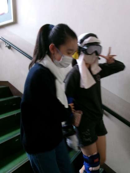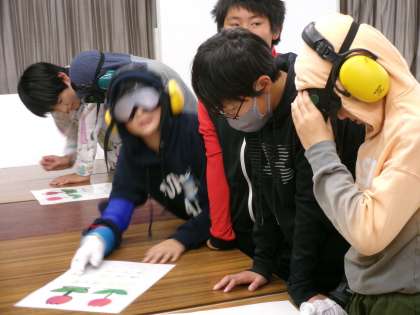 子どもは、見えにくいゴーグルを付け、膝関節が曲がりにくいようにサポーターや重りを付けて高齢者の気持ちになって階段を上ったり、字や絵を書いたり、小さなものをつまんだりしました。「お年寄りの方は、こんなに歩きにくいんだ」「小さなものはつまみにくい」など実感しました。高齢者の方への声掛けが大事なことを学びました。
