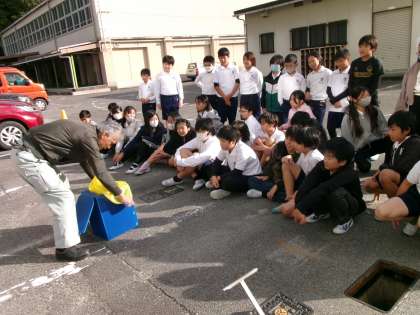 防災対策課の方がみえて、仮設トイレについて学び、避難上での段ボール間仕切りを行いました。