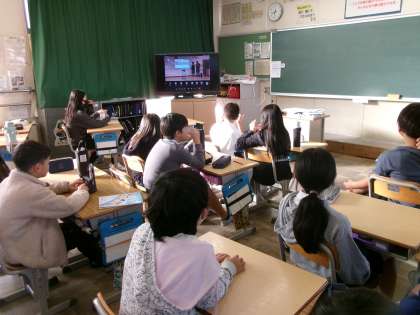 校歌を歌ったり、JRC委員会の連絡をしたり、6年生からは修学旅行の様子をを全校に伝えました。