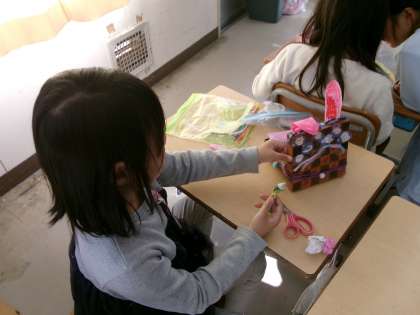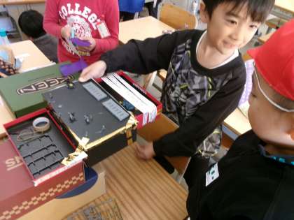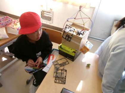 1年生が、図工事時間に空き箱や小物を使って、自分の好きなものを作っています。