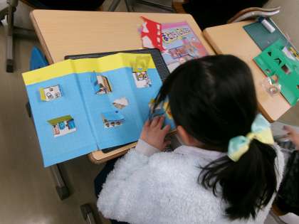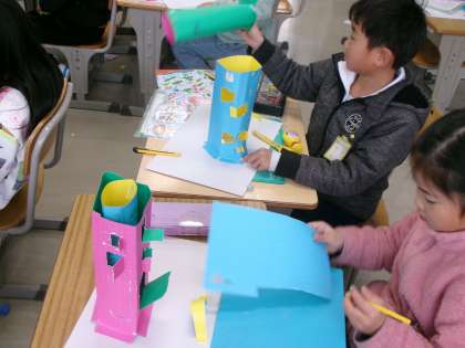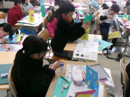 2年生の図工の「窓からこんにちは」学習では、自分が作りたい世界を自由に表現していました。