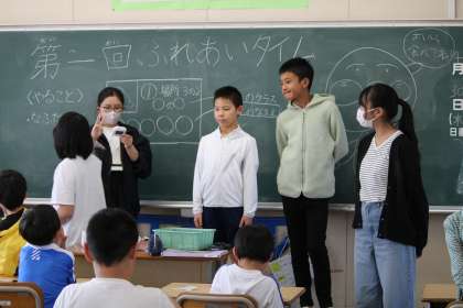 4月30日、第1回ふれあいタイムを行いました。これは1〜6年生が縦割り班になり、いろいろな活動を行っていく、本校のふれあい活動の一環です。今日は第1回目なので、顔合わせでした。同じ班になった子たちに自己紹介をしたり、ゲームで遊んだり。どの班も6年生が前々から準備をしてくれていたので、下学年もとても楽しそうでした。みんなで班の名札も作りました。次回からこの名札をつけて遊びます。
