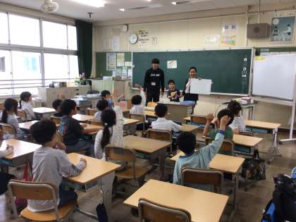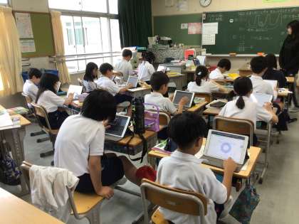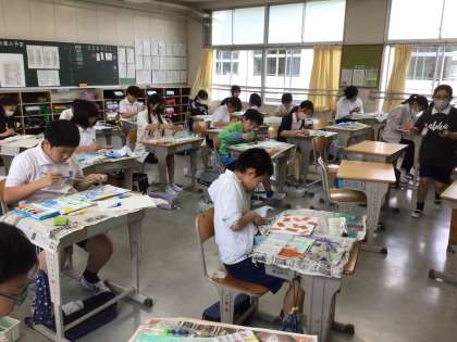 5月9日の授業の様子です。2年生では、ALTと一緒に外国語で遊んでいました。ゲームを行い、みんな「分かった!」と大喜び!楽しそうに外国語を学んでいました。5年生は、社会の水害を防ぐ学習で、キュビナを使って復習をしていました。キュビナはAIが搭載されているので、その子その子に合った学習を行うことができます。みんな真剣に行っていました。6年生は図工で真剣に色を塗っていました。よく見ると、筆だけではなく、網やストローなどいろいろいろな材料を使っています。「音を表現してみよう」という面白い学習でした。