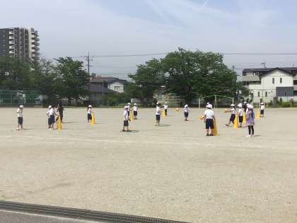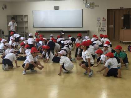 5月21日、今日も暑い1日となりました。現在、水泳をコナミスポーツクラブで行っていますが、学校でも体育の授業を行っています。学校では、朝の涼しい時には、外で、WBGTを見て、外でできない時には、体育館や、広い教室を使って行っています。今日は2年生が朝、休憩をとりながら、ボール遊びをしていました。WBGTがあがってきたので、1年生はひよどりホールで、仲間作りゲームや、進化ジャンケンゲームを行っていました。みんな楽しそうでした。