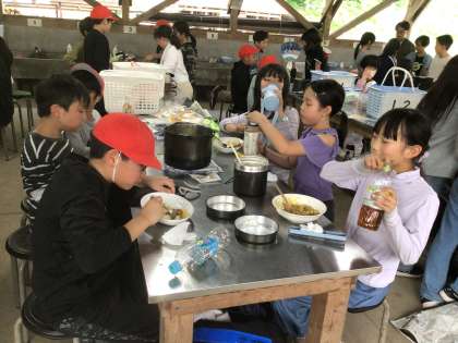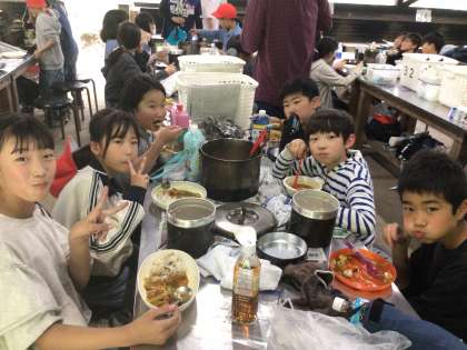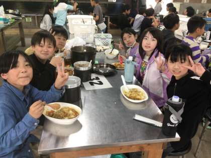 カレーができました。水っぽいカレーがあったり、こげたご飯があったりしましたが、「美味しい!」とパクパク。夕飯の片付けもおわり、今はファイヤーの準備です。