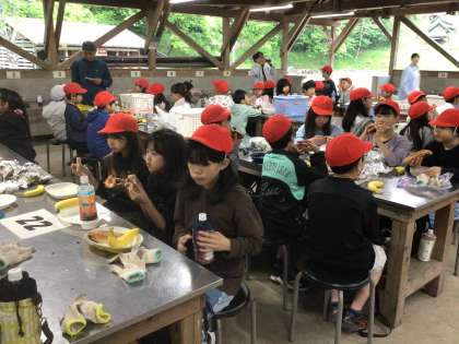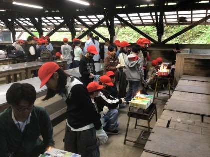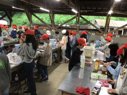 今日の六所は曇り空。霧雨が少し降っています。昨日、たくさん動いて疲れた子どもたちは、しっかり寝たので、みんな元気です。朝ごはんにはカートインドッグを作って食べました。チャッカマンの付け方が分からず、火にびっくりしている子もいましたが、みんなできあがり、美味しそうに食べていました。