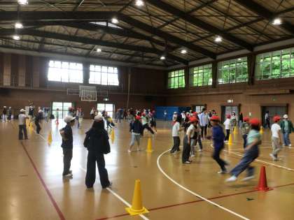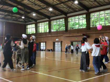 室内でみんなで遊びました。係の子たちがいろいろ考えたハンディキャップドッジボールや風船チャレンジ、根川ドッジボールなどをしました。みんな2日目とは思えないような元気さで、体育館を走り回っています。楽しそうに遊んでいます。