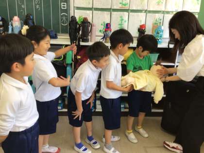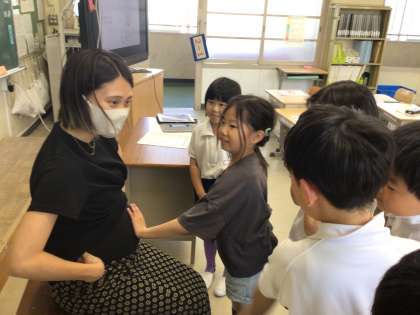 2年生でいのちの授業を行いました。なぜおへそがあるのかなということから、へその緒の仕組みや、お腹の中で大切に育ててもらうことを養護教諭から学びました。その後、赤ちゃん人形を抱っこしたり、赤ちゃんの重さの物をお腹につけたりして、体験活動をしました。「重い!」「転びそう」などと、思い思い感想を言っていました。妊婦の教員にお腹を触らせてもらい、「動いてる!」「ぼくのお母さんもこんなふうだったよ!」と目を輝かせて話していました。何か命について感じてくれるといいなと思います。