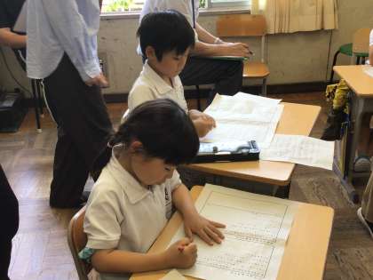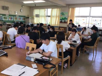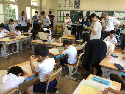 2年生の国語の授業の様子です。学校中の先生たちが集まり、授業を見ました。子どもたちが帰った後に、教員が集まり、この授業をもとに、ここはよかったが、こういうところはこうすればよかったなど、協議会をします。同じ授業を参観することで、話が具体的になり、今回話し合ったことを自分の授業でも使ってやっていきます。このような研究授業を時々行い、教員の授業力アップをはかっていきます。