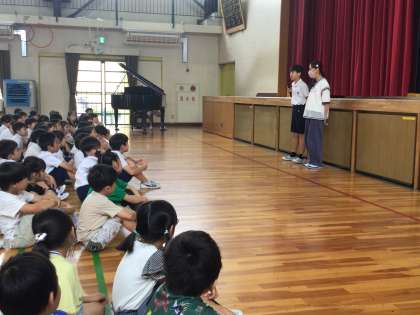 今年度第2回目の児童朝会を行いました。放送委員会の子が運営し、他の委員会の子たちからも全校児童にお願いをしたり、連絡をしたり、自分たちのやっていることを発表したりする会です。