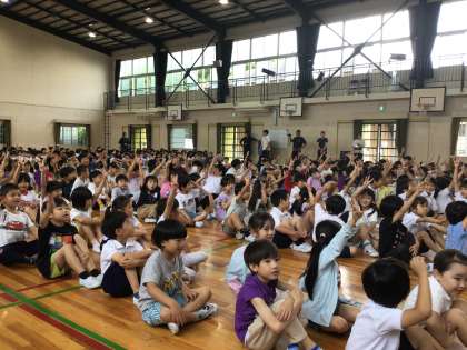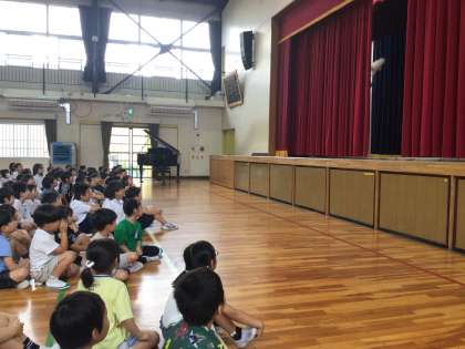 今日は、各委員会からのお知らせと、放送委員会の子が考えたゲームをしました。幕と幕の間に飛ばされた物を当てるゲームでしたが、みんな大盛り上がり。最後には、先生も飛び、大喜びの子どもたちでした。委員会の子たちありがとう。