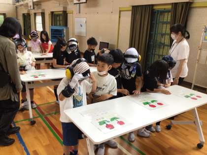 3年生が講師の方をお招きし、高齢者疑似体験を行いました。お話を聞いてから、実際に高齢者になって動いてみました。手足におもりをつけ、手袋をはめ、ゴーグルとヘッドフォンをつけた子どもたちは、すごく動きにくそう。階段を歩いてみたり、字を読んだり、お金をつかんだりしながら、「見えにくいよ」「手が動かなくて、つかめない」「足が重い」と実感したようです。高齢者の気持ちを考えて動けるといいなと思います。