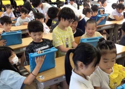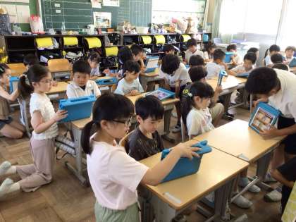 4年生が国語の授業で作った絵本を、1年生に読み聞かせをしました。一人一人、学習用タブレットを使って自分の絵本を作り、それを1年生に読んであげます。初め、「緊張する!」と言っていた4年生の子どもたちでしたが、1年生の子に読んであげるうちに、次第に熱が入ります。1年生の笑った顔や、真剣に聞いてくれた顔が嬉しかったようです。相手意識をもって学んだことが、4年生にも1年生にもプラスになりました。