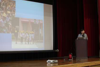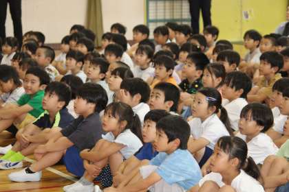 夏休み前集会を行いました。校長先生から、みんなの4月から7月の様子と、長い休みにしかできないことに何か挑戦してほしいという話がありました。生徒指導の先生からは、赤(火)、青(水)、黄(交通安全)、黒(不審者)の4色に気を付けましょうという話がありました。保健の先生からは、休み中、9〜12時間は寝ましょうという話がありました。みんな真剣に聞いていました。最後には校歌を元気よく歌いました。