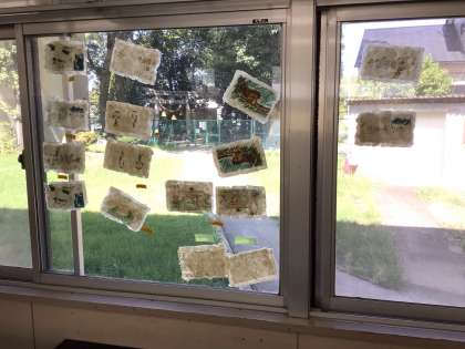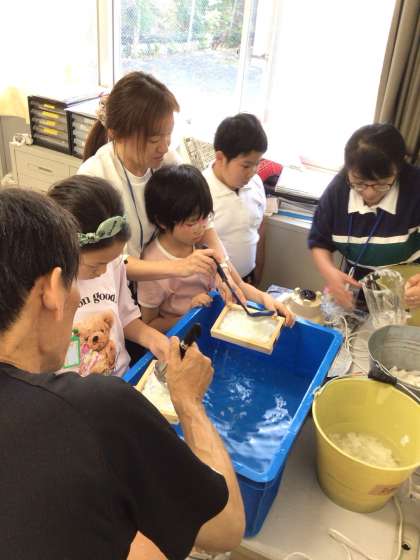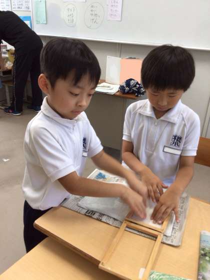 1、2、3学級が、紙漉きをしていました。牛乳パックを柔らかくして、紙漉きをし、夏休みの思い出をハガキにしました。「ドロドロだ!」と言いながら、真剣に紙漉きをしていました。昨年度も行った高学年の子が、低学年を助けながら、全員自分のハガキを作り上げました。これを手づくり絵はがきコンクールに応募する予定です。