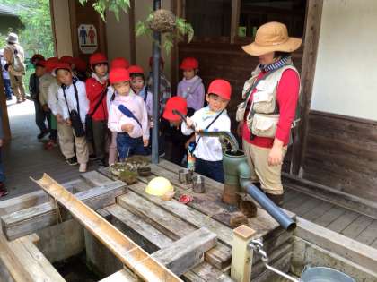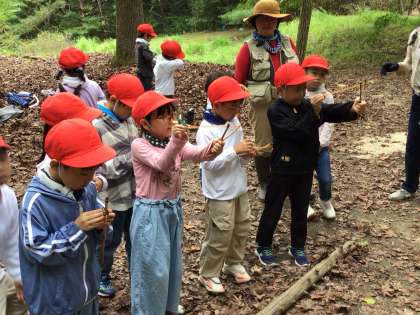今日も1年生のもう片方のクラスが、トヨタの森に出かけました。井戸のポンプで水を汲んだり、池の中から珍しいミズカマキリを見つけたりしました。木の実をパチンコで飛ばすなど、みんなで楽しんで学習しました。学校に帰ってきてからも、「ミズカマキリ知ってる?」と他の先生に聞いたりする子もいて、よい学習となりました。