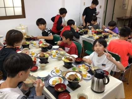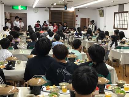 旅館で夕飯です。入館式と兼ねて行いましたが、旅館の方にはしっかりとあいさつをし、その後、班で楽しく夕飯をいただきました。食べた後は自発的に片付けを始めた子どもたちです。
