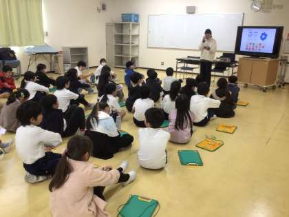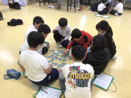 4年生がアイシン高岡の方に来ていただき、愛シンパシーワークショップを行いました。愛シンパシーゲームを行いました。これは、人間と動物に分かれて、動物が様々な自然物の神経衰弱を行いますが、その間に人間がいくつかカードを取っていき、どんどん選ぶものが少なくなってくるという、SDGsを考えるゲームです。やっているうちに子どもたちは、自分ごととして、自然を守ることの大切さを学んでいきます。今まで何度かいろいろな角度から考えてきた子どもたちですが、自分たちのこれからに生かしていってほしいと思います。