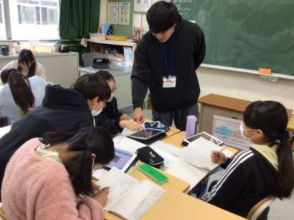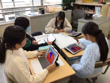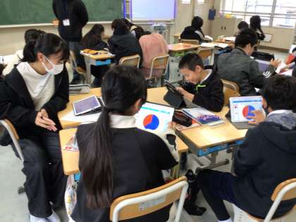 6年生の国語の授業の様子です。「学校をより良くするためにどうしたら良いか」について、「廊下歩行」「あいさつ」「ゴミの分別」など、自分たちで課題を見つけ、どうしたらよいかを話し合っていました。タブレットで調べたり、アンケートをとったりして、「こんなのはどうかな?」「これがいいんじゃない?」などと、自分たちなりの方法を考えて、プレゼンするのだそうです。子どもたちが自分たちで考えた方法を楽しみにしています。