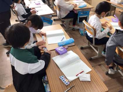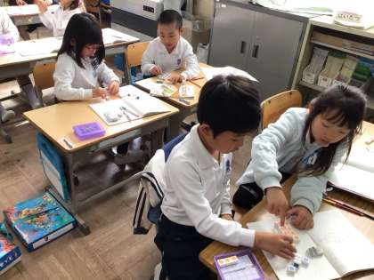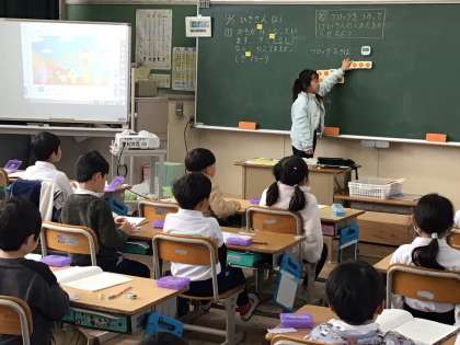 今日の1年生の授業の様子です。1つのクラスでは、算数の引き算の学習をしていました。ブロックを使って考えます。できるだけ早く正確にできるようなブロックの取り方を自分たちで考え、それを使って隣の子と話し合ったり、前に出て説明したりしていました。1年生も上手に説明できるようになってきました。