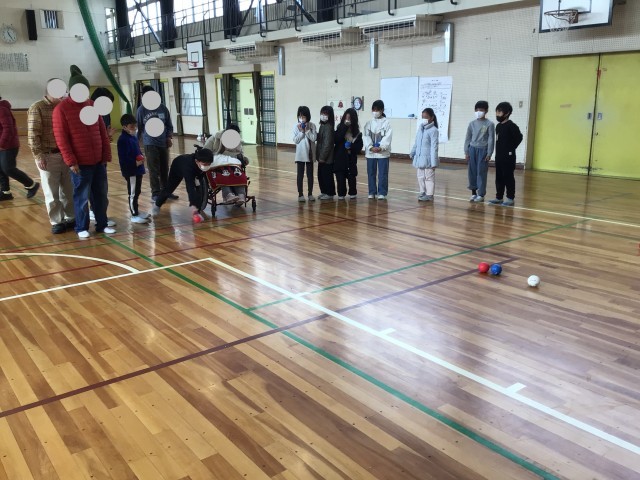 地域の福祉施設の方が来てくださり、3年生が福祉について学びました。障がい者の方とボッチャをして交流したり、障がい者の方にどう接すればよいのか聞いたり、車いすの体験をしたりしました。車いすに乗っていた子が段差で前のめりになって、「こわい!落ちそうだよ!」と叫んだり、ボッチャをしていた子が「難しい!当たらない!」などと言い合ったり、楽しみながらも、いろいろ感じてくれたようです。地域の方から学ぶことができる、よい機会をありがとうございました。
