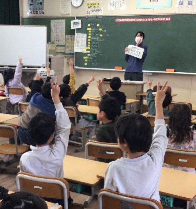1年生に、給食センターの調理員の方が来てくださり、給食への思いを話していただきました。給食が学校に来るまでにどうなっているのか、栄養教諭の指導で、ビデオや写真を見ながら学習しました。何人分作っているかとの問いに、「100人!」「1000人だよ!」と言っていましたが、7100人という話を聞き、「ええーっ!」と驚きの声が聞かれました。調理員の方から思いを聞き、授業が終わった時には、「今日の給食は残さず食べるよ!」と言っていました。