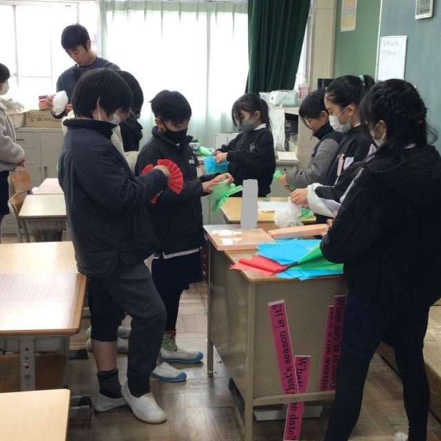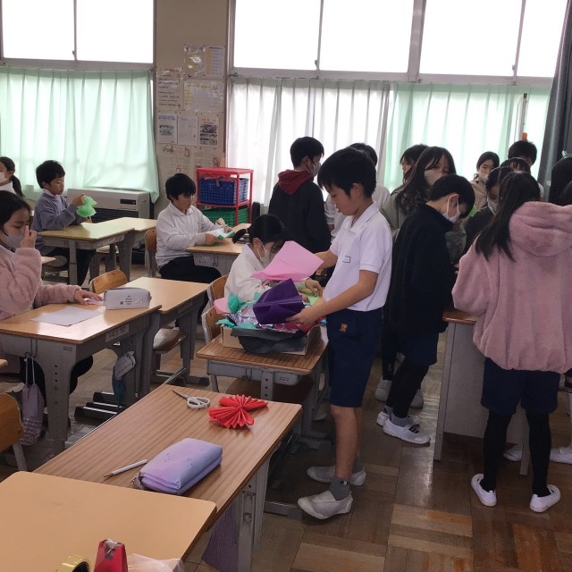 4年生が、お花紙で花を作っていました。色も工夫して、色とりどりの花がどんどん出来上がっていきます。これは6年生を送る会で使うそうです。6年生に感謝の気持ちを込めて全校で送りたいです。